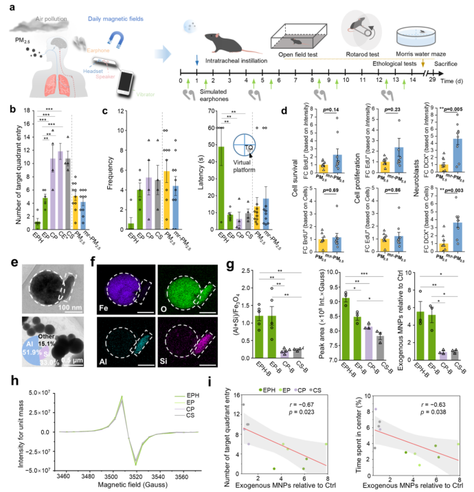 行为学测试结果显示,同时暴露于磁场和磁性颗粒的小鼠在Morris水迷宫测试中表现显著下降,目标象限停留时间缩短,逃逸潜伏期延长,表明空间学习与记忆能力受损(图2b-c)。更关键的是,通过透射电镜和元素图谱分析,研究人员在小鼠大脑中检测到了外源性磁铁矿颗粒,这些颗粒带有典型的高温燃烧生成特征(如铝、硅共存),证实其来源于空气污染(图2e-f)。电子顺磁共振定量分析表明,共暴露组小鼠大脑中的外源性磁性颗粒浓度比无磁场组高出五倍以上(图2h)。相关性分析显示,脑内磁铁矿含量越高,小鼠的行为学表现越差(图2i)。