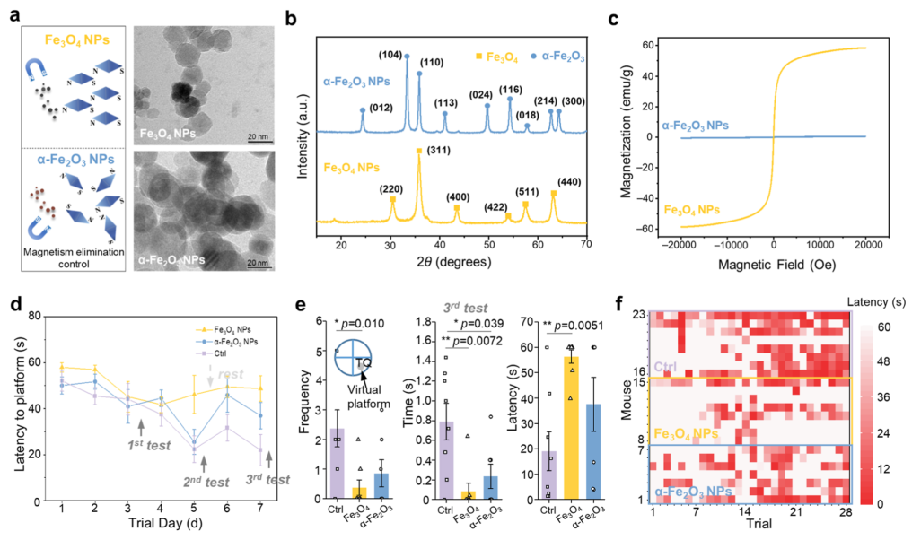 为了厘清究竟是“磁性”还是“化学组成”导致了神经毒性,研究团队对比了磁性Fe₃O₄颗粒与非磁性α-Fe₂O₃颗粒在磁场下的效应(图3a-c)。结果显示,只有磁性颗粒在磁场下才会诱发显著的认知功能障碍(图3d-f),这进一步证实了磁性本身在毒性机制中的核心作用。