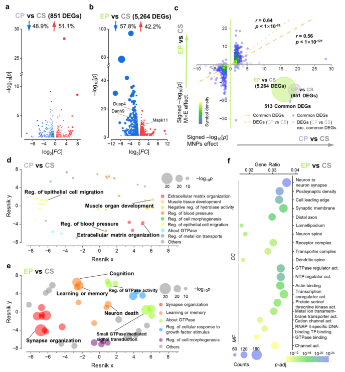 图4. EEM与PM₂.₅共暴露诱导的海马转录组改变。 (a,b) 差异表达基因火山图。 (c) 共暴露组与单独磁铁矿纳米颗粒暴露组海马差异表达基因的-log10(p值)相关性。 (d,e) 基于REVIGO总结的差异表达基因GO生物过程术语分层网络。 (f) 差异表达基因的GO分子功能和细胞组分分析。 (g) 共暴露效应的KEGG通路分析。