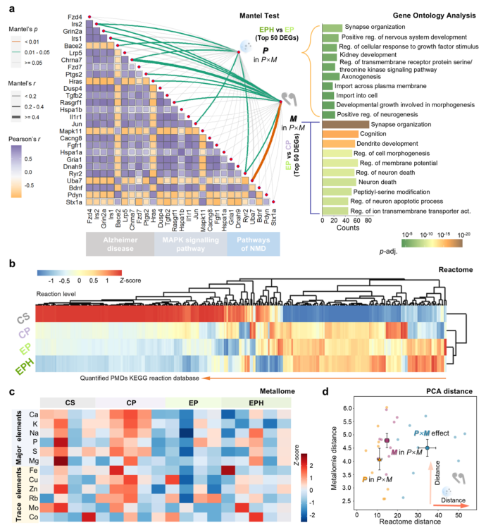 通过转录组学分析,研究发现共暴露导致海马区大量基因表达失调(图4a-b),特别是与认知、学习、记忆及神经元死亡相关的生物过程被显著富集(图4e)。KEGG通路分析显示,阿尔茨海默病、MAPK信号通路及神经退行性疾病通路中的关键基因出现显著下调(图4g)。进一步的组学整合分析揭示,磁场暴露对神经系统的影响甚至比单纯增加颗粒剂量更为显著(图5a)。此外,血浆中的金属组和反应组也发生了显著变化,表明共暴露不仅影响大脑,还引发了全身性的代谢紊乱(图5b-d)。